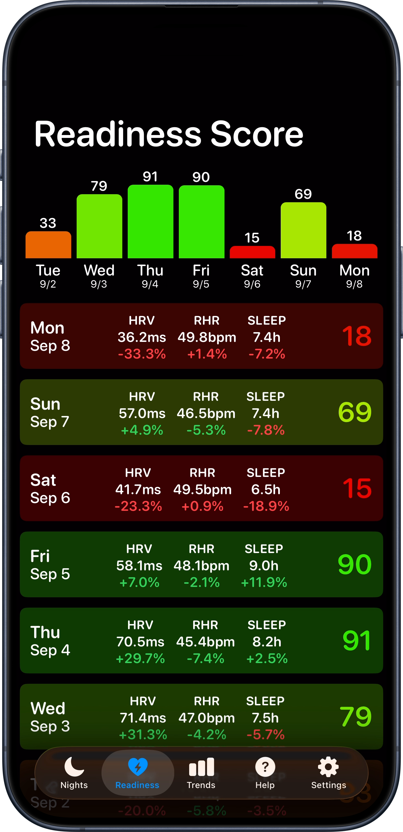 Review your whole week, dive into a single night or review your Readiness Score, all from your iPhone.